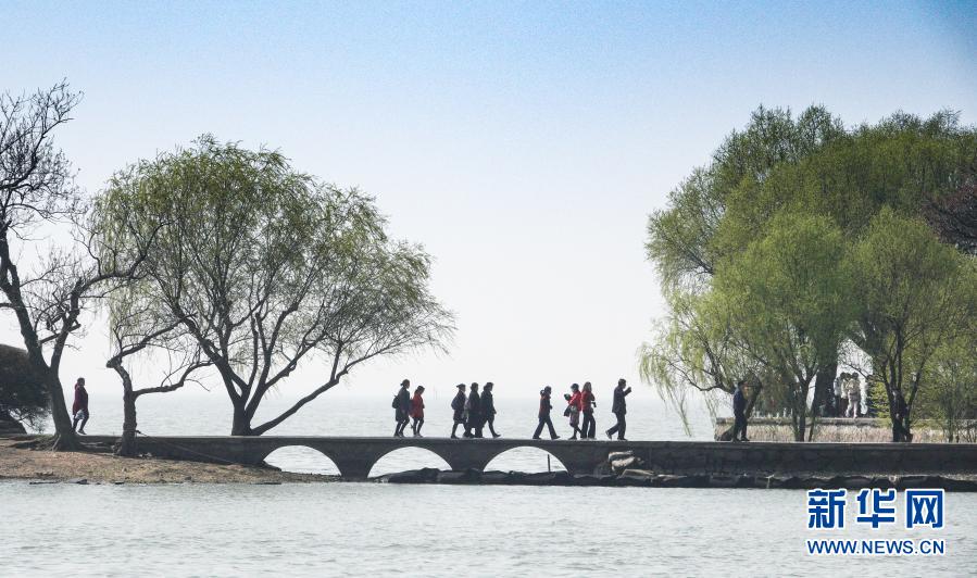 3月13日,游人在江蘇省無錫市太湖黿頭渚景區游覽。