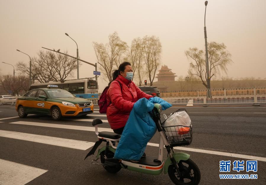 3月15日,市民騎車(chē)從北京故宮角樓附近經(jīng)過(guò)。當(dāng)日,我國(guó)北方多地出現(xiàn)沙塵天氣。新華社記者 陳曄華 攝