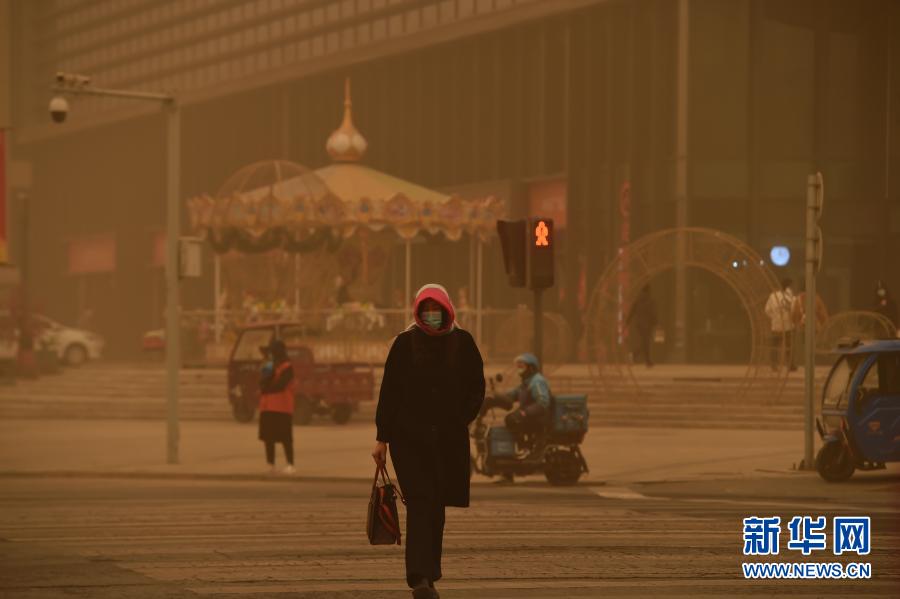 3月15日,寧夏銀川市民在沙塵中通過十字路口。當(dāng)日,我國(guó)北方多地出現(xiàn)沙塵天氣。新華社記者 唐如峰 攝