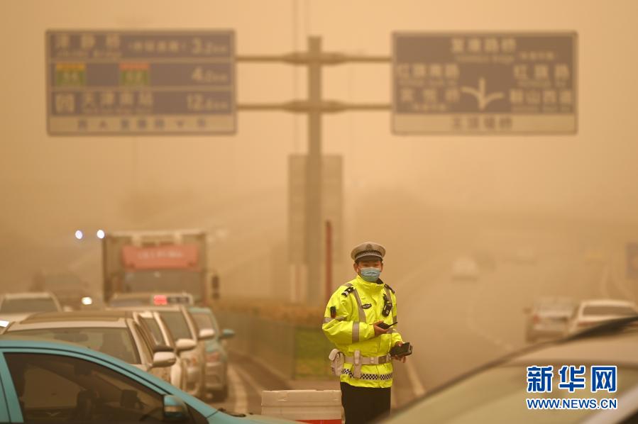 3月15日,交警在天津市南開區道路上執勤。當日,我國北方多地出現沙塵天氣。新華社記者 李然 攝