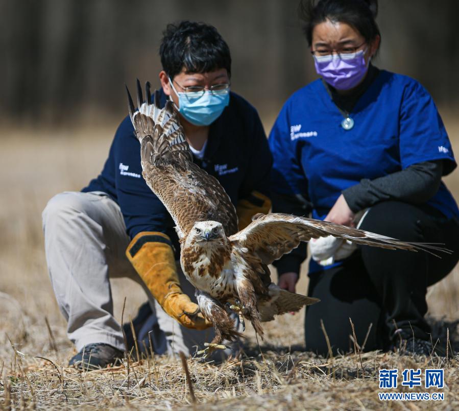 3月20日,北京猛禽救助中心猛禽康復師戴暢(右)和周蕾放飛大鵟。新華社記者 李京 攝