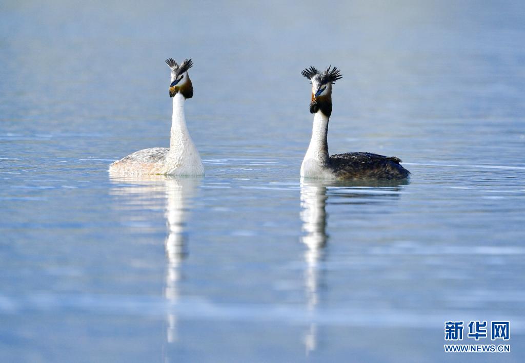6月14日在拉魯濕地拍攝的兩只鳳頭??。夏日里,鳳頭??和小??在西藏拉薩拉魯濕地國家級自然保護區水面上嬉戲。新華社記者 張汝鋒 攝