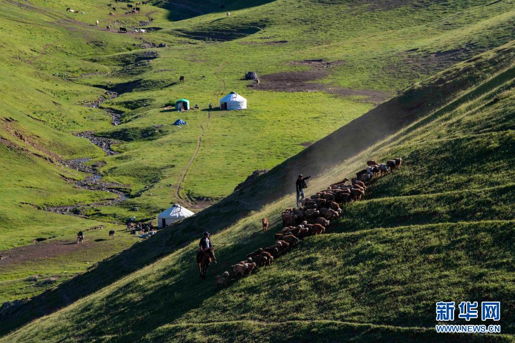 眼下,巴爾魯克山區的夏牧場迎來放牧黃金季。群山起伏,峰巒翠綠,氈房、牛羊等牲畜分散點綴其間,自駕游客時而穿梭往來,共同譜寫一曲高山夏季牧歌。