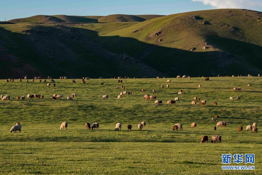 新疆裕民縣巴爾魯克山區(qū)夏牧場上的羊群(6月15日攝)。