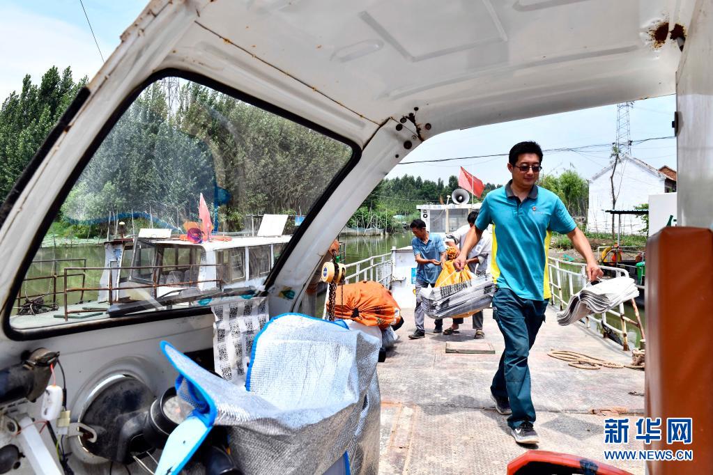 6月20日,在微山縣南陽鎮南陽碼頭,郵遞員王少朋從渡輪上搬卸郵件。南陽鎮的郵件往來全靠船進船出。