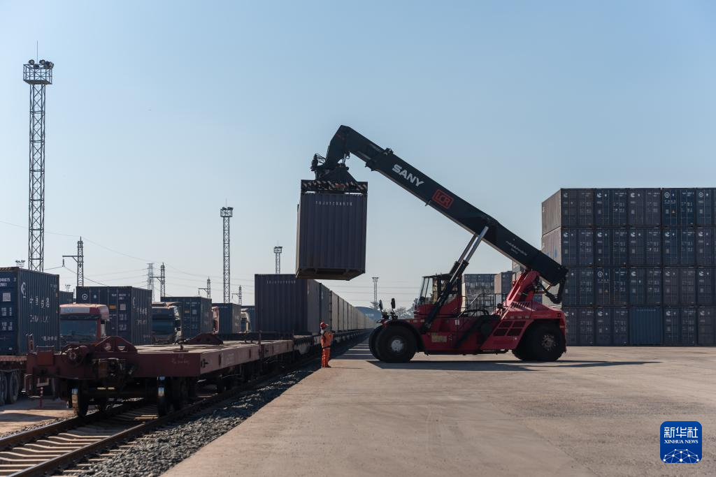 11月29日,在老挝首都万象中老铁路万象南站,发往中国郑州的木薯淀粉班列准备出发。新华社发(凯乔摄)