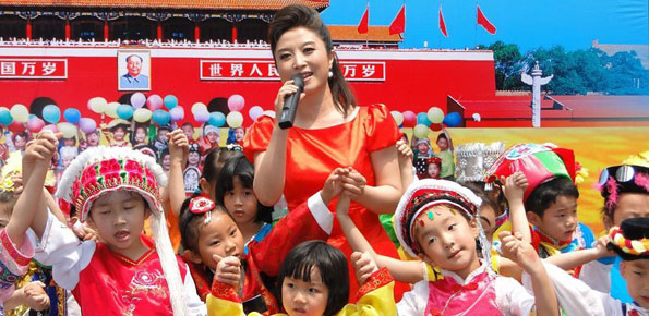 譚晶著中國(guó)紅長(zhǎng)裙獻(xiàn)唱