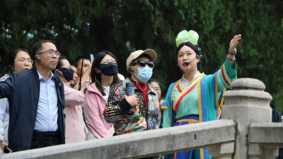国庆中秋假期,晋祠博物馆的讲解员身着宋代服饰,化身彩塑侍女,讲述晋祠的历史文化,吸引了不少游客拍照围观。