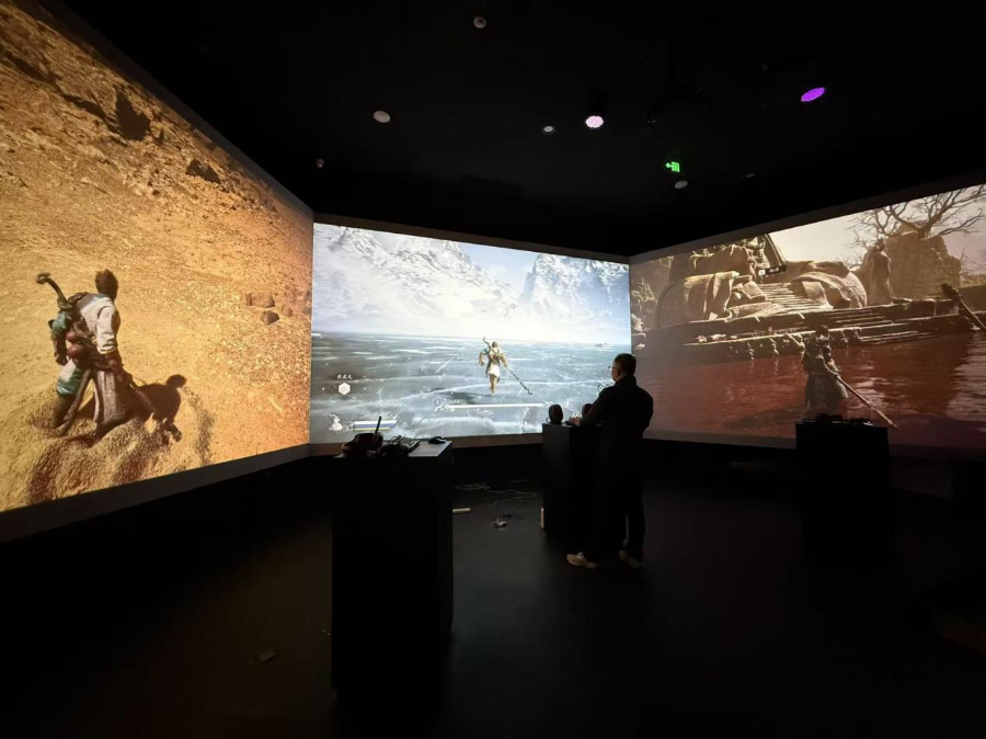 「黑神话:悟空」遇见山西——古建数字艺术展开展前的媒体开放日上,前来体验的游客在沉浸式体验区体验游戏对决。新华网 王梦佳 摄