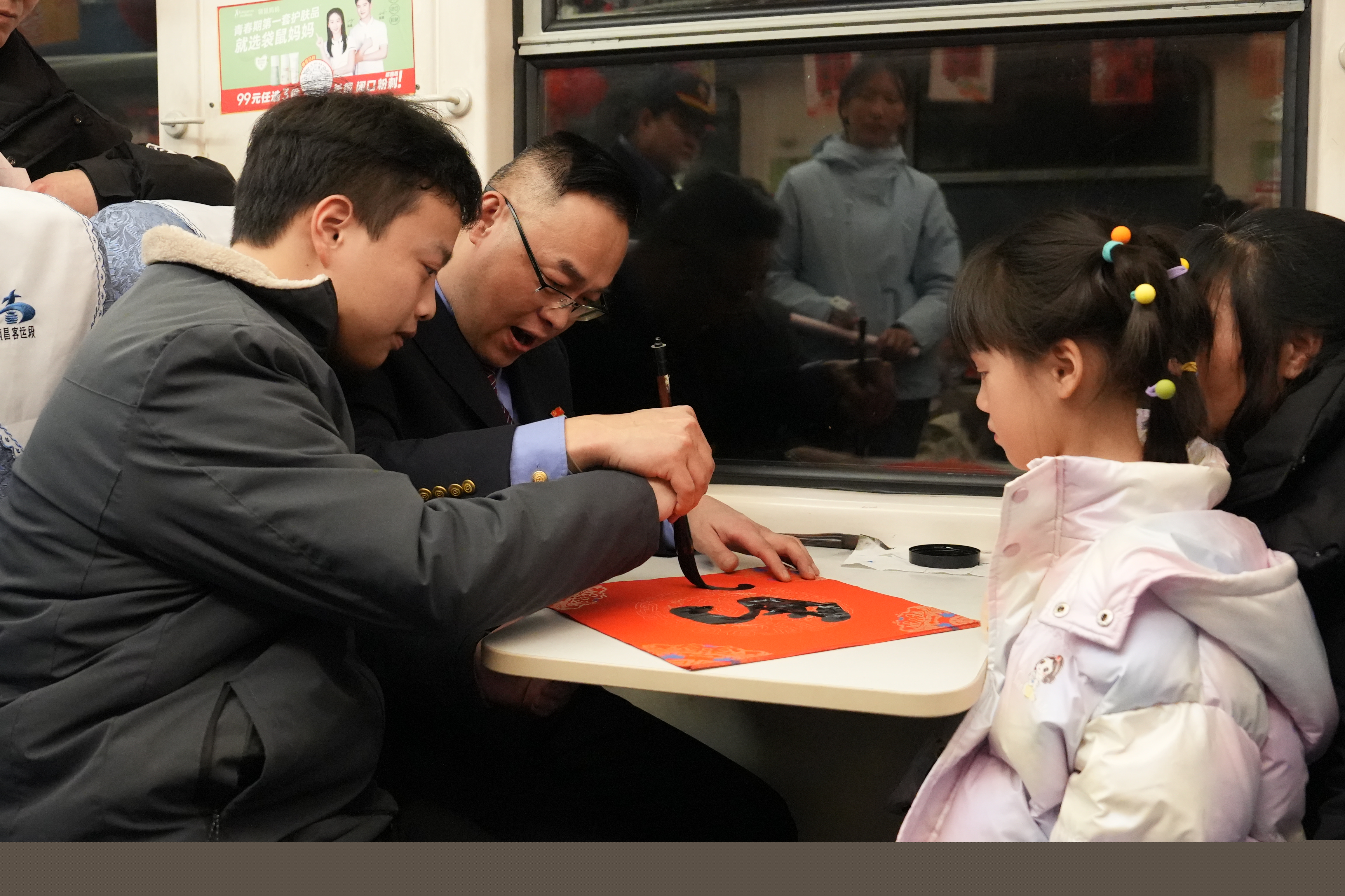 一踏入车厢,浓浓的节日气息便扑面而来。红色灯笼在行李架上摇曳生姿,剪纸窗花在玻璃窗上绽放春意,彩带如流星般穿梭在车厢之间,处处洋溢着喜庆与祥和。