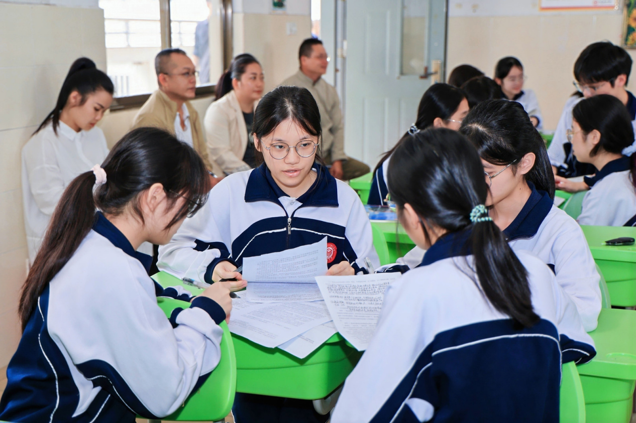 嘉宾沿定制路线参观,在学生讲解中了解学校 76 年办学历程。益才广场上,第五届科技体育艺术节现场展示陶艺、扎染、麻绳编织等非遗技艺,武术和盅盘舞等节目展现浓郁本土特色,嘉宾通过投票互动直观感受学校五育融合的实践成果。