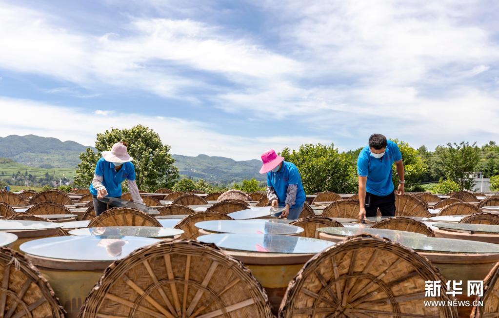 7月10日,工人在畢節市金沙縣禹謨鎮泡木灣醬醋基地查看醬醋晾曬情況。新華社發(范暉攝)