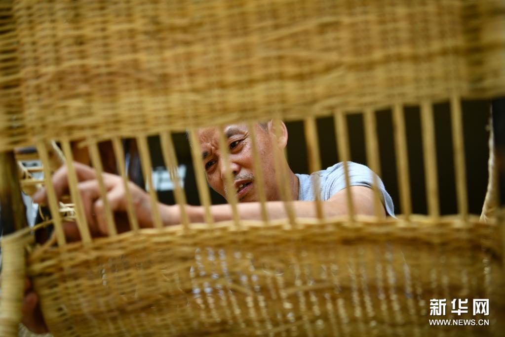 7月10日,在遵義市匯川區板橋鎮婁山關社區,居民在藤編作坊里加工藤椅。新華社發(羅星漢 攝)