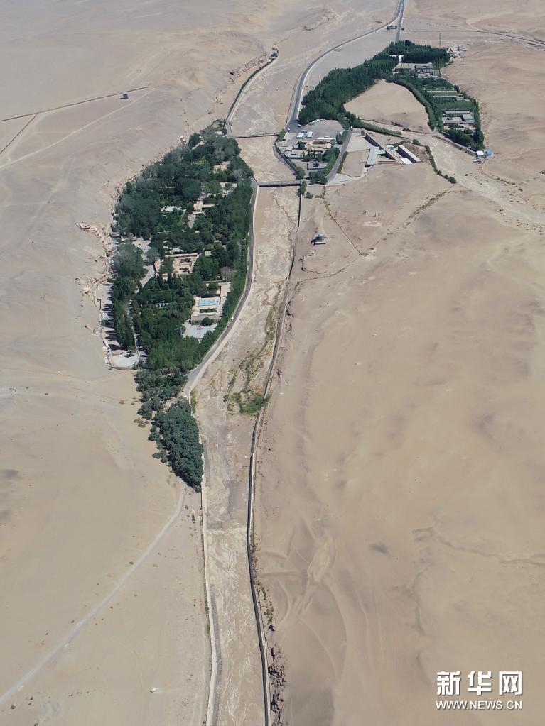 大泉河及其流經的敦煌莫高窟(7月6日攝,無人機照片)。新華社記者 劉詩平 攝