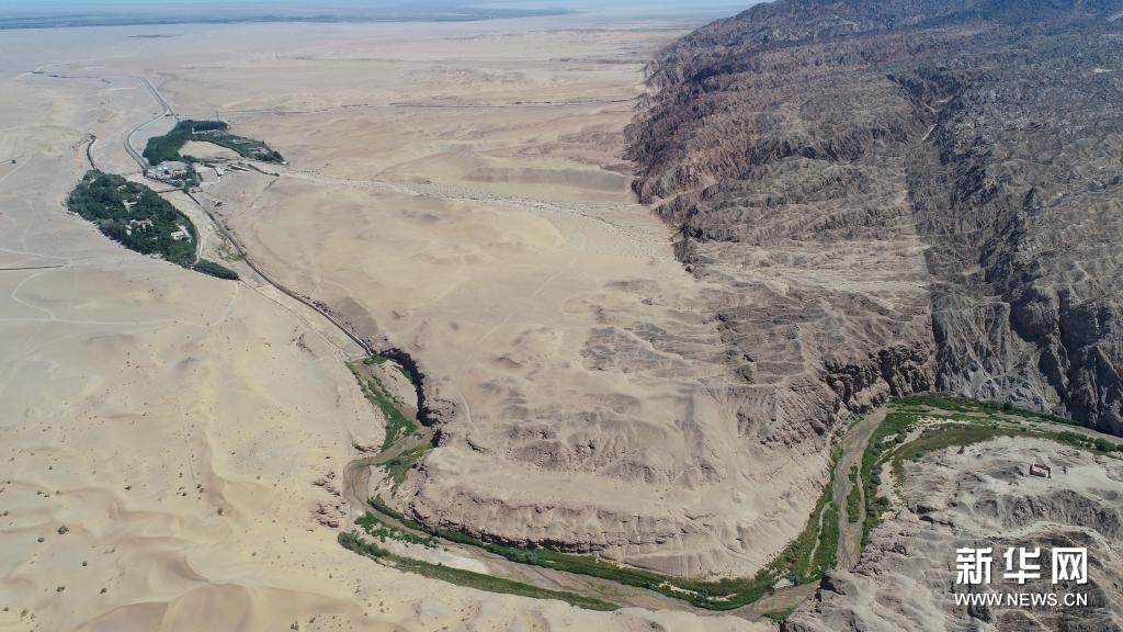 鳥瞰大泉河及其流經的敦煌莫高窟(7月6日攝,無人機照片)。新華社記者 劉詩平 攝