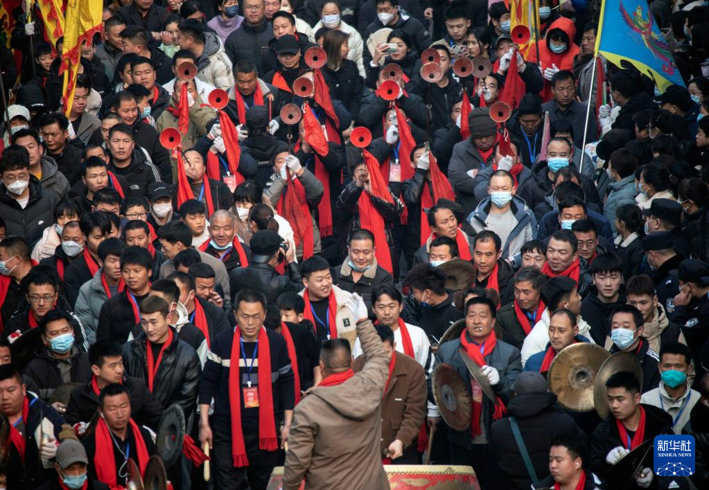 2月6日,社火团队在等候入场表演(无人机照片)。