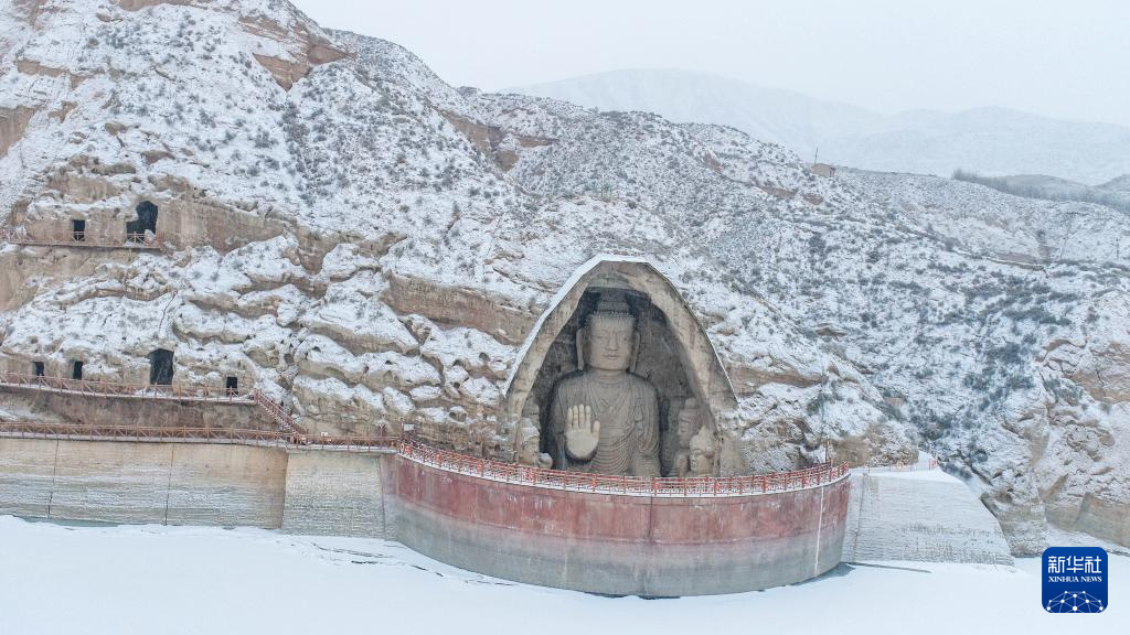 当日,位于甘肃省武威市凉州区的天梯山石窟迎来一场降雪。在皑皑白雪映衬下,窟区造像与原野山川构成一幅宁谧而优美的画卷。