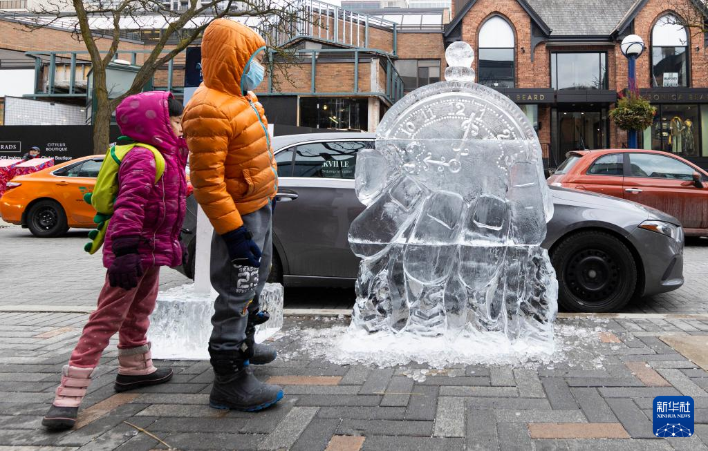 2月18日,人们在加拿大多伦多街头欣赏冰雕作品。