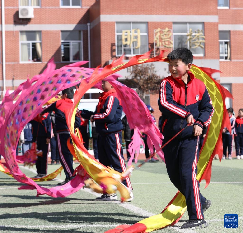2月21日,河北省邢台市东牛角小学学生在表演舞龙。