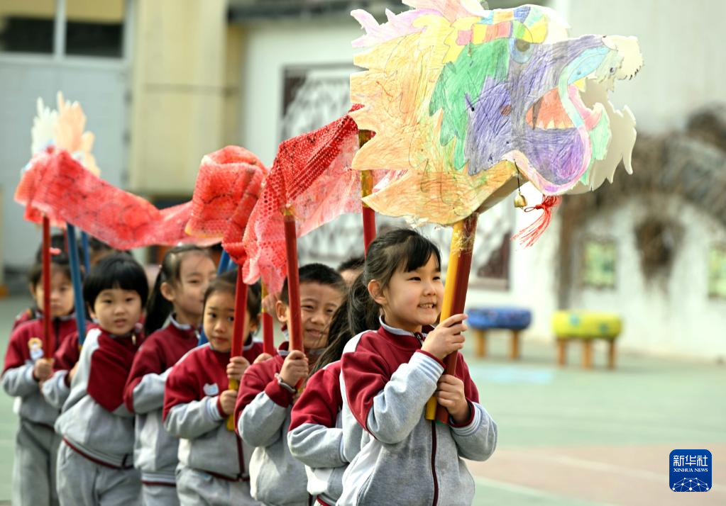 2月21日,在河北省石家庄市井陉矿区天护幼儿园,小朋友们在“二月二 龙抬头”主题活动中表演舞龙。