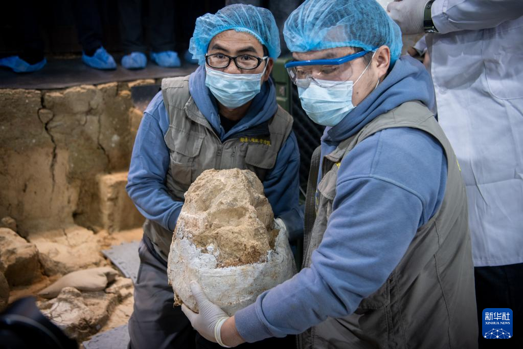 湖北十堰市学堂梁子(郧县人)旧石器时代遗址发掘现场被命名为“郧县人3号头骨”古人类头骨化石出土情况(资料照片)。