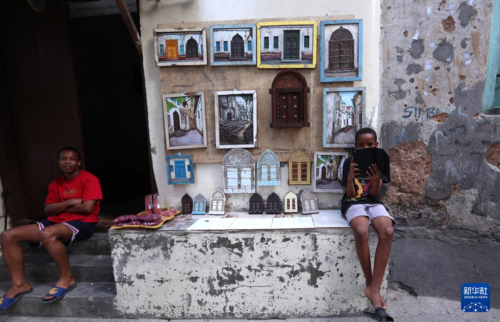 2月23日,两名男孩在桑给巴尔石头城等待顾客。