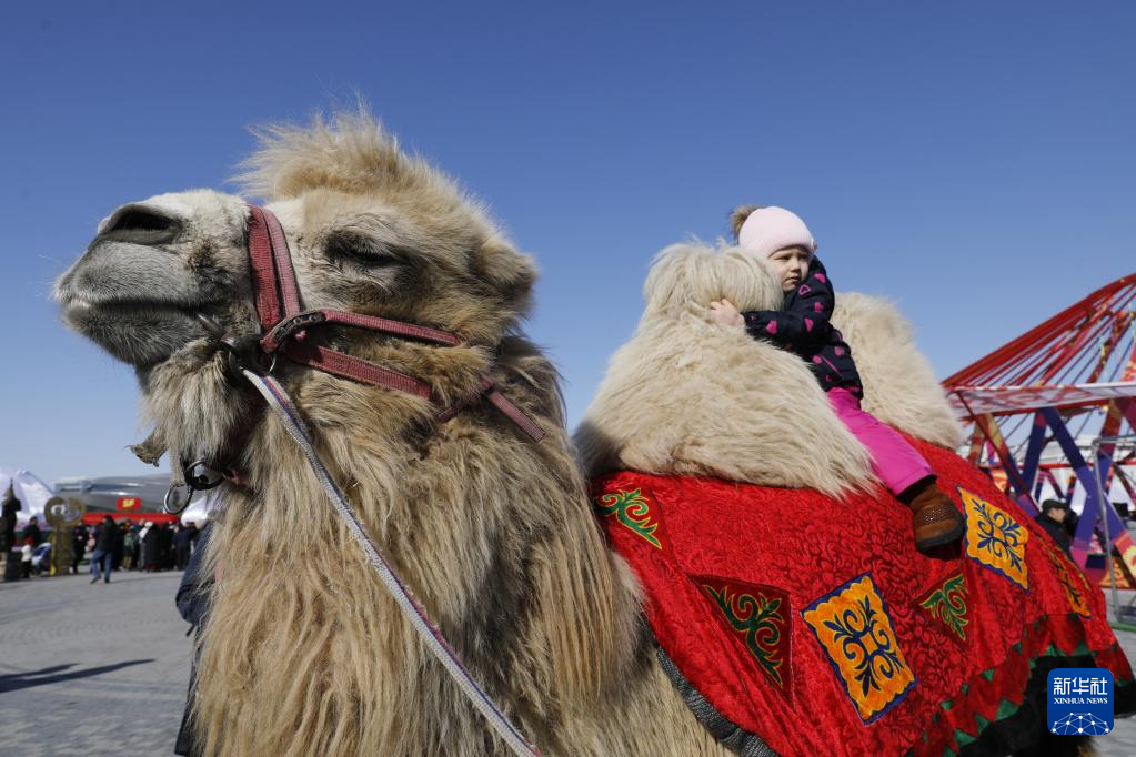 3月22日,在哈萨克斯坦首都阿斯塔纳,一名儿童体验骑骆驼。