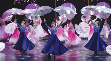 3月21日,在位于山东省济南市的山东省会大剧院,演员表演魔术节目《飞花令·伞》。