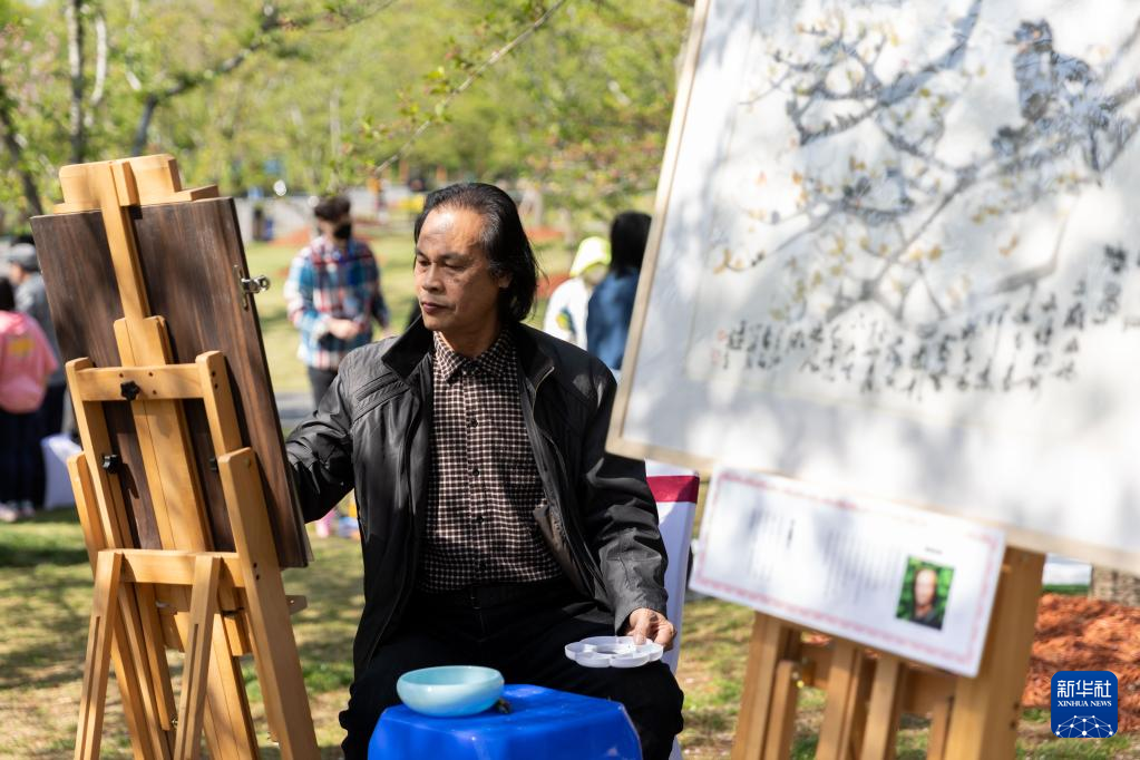 4月8日,书画家在上海市宝山区顾村公园“樱画书艺”主题展览上创作。