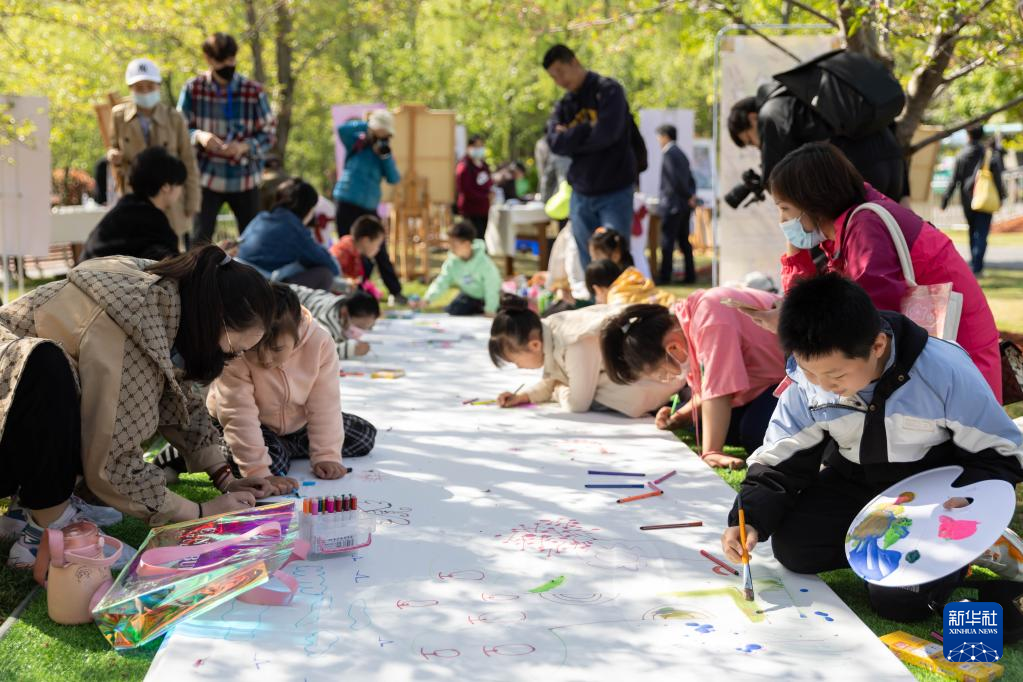 4月8日,孩子们在上海市宝山区顾村公园“樱画书艺”活动上创作。