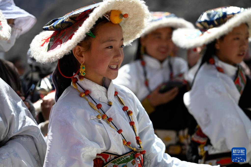 4月12日,小朋友在卓木齐村举办的糌粑节上欣赏歌舞表演。
