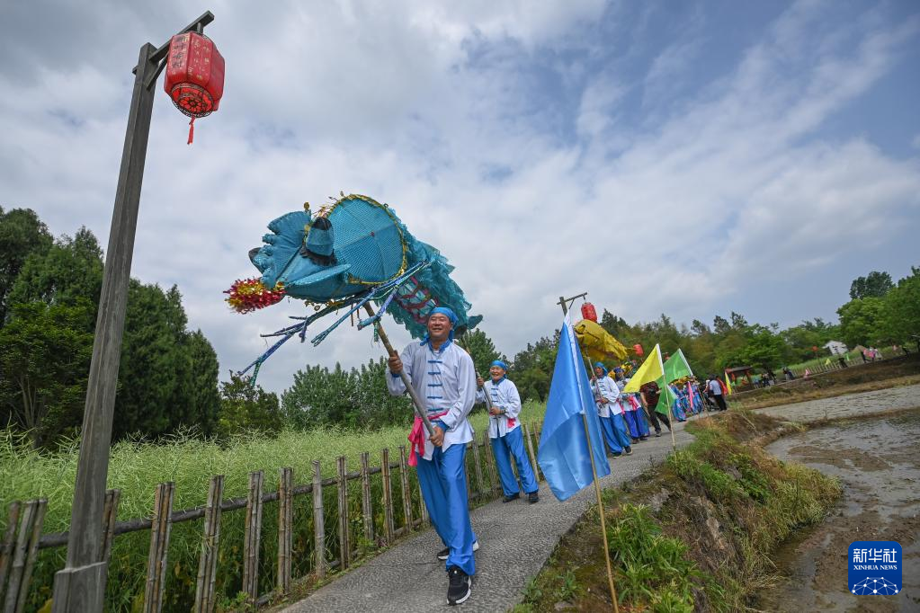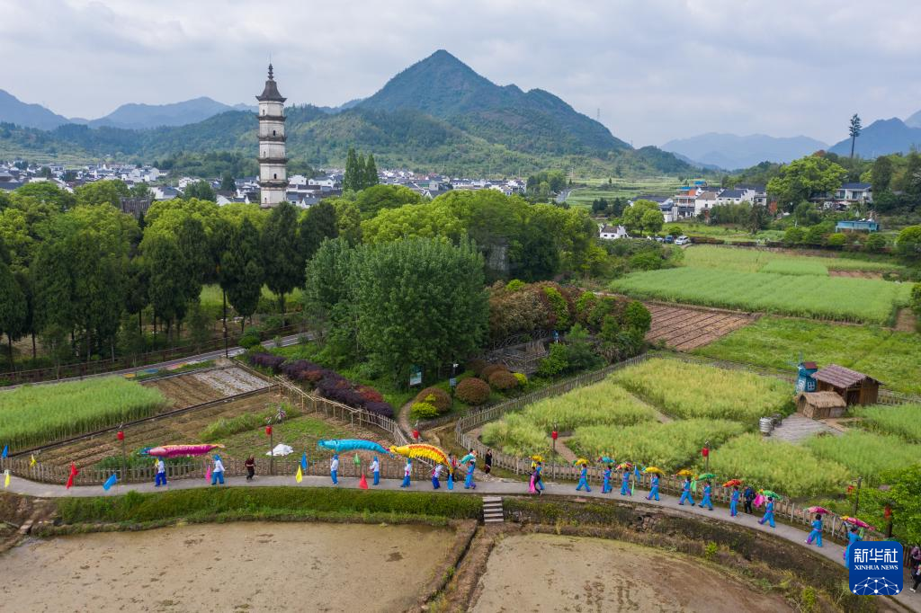 4月21日,“严州虾灯”展演队伍行走在建德市大慈岩镇新叶古村的田野中。