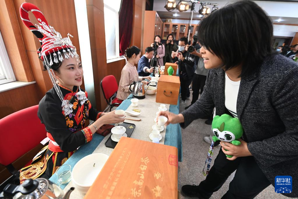 4月25日,来自柘荣县的茶艺师(左)向新闻发布会参加者介绍高山白茶。