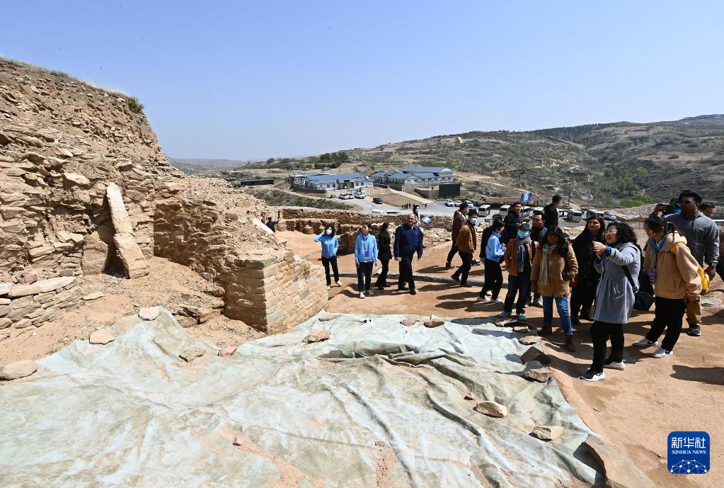 4月26日,外宾在陕西石峁遗址东城门遗址参观调研遗址保护情况。