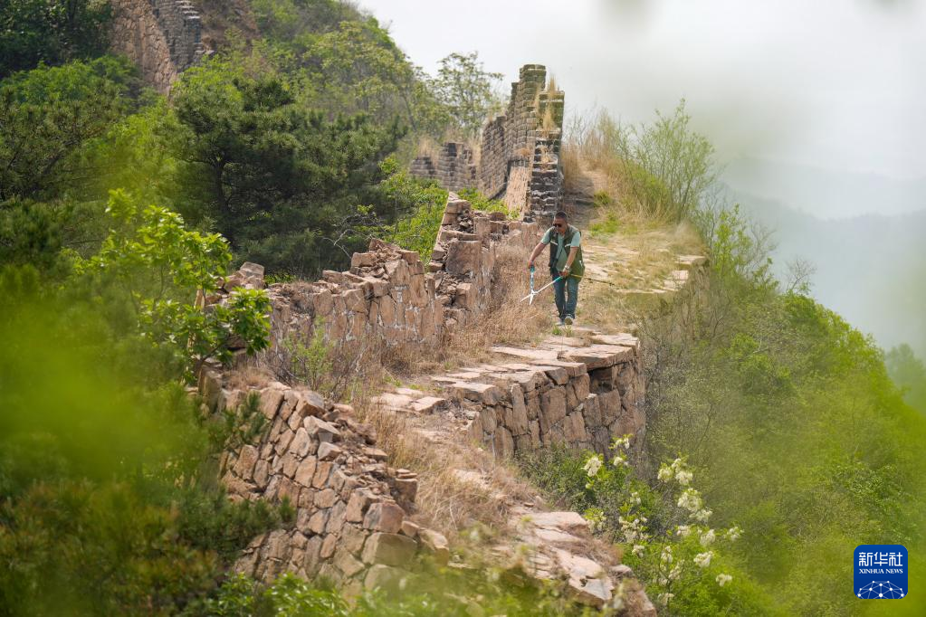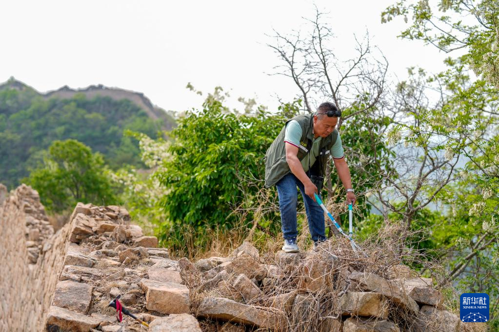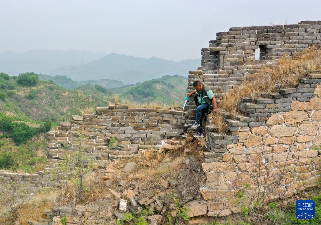 5月13日,赵春生在前后杖子段长城上清理杂草。