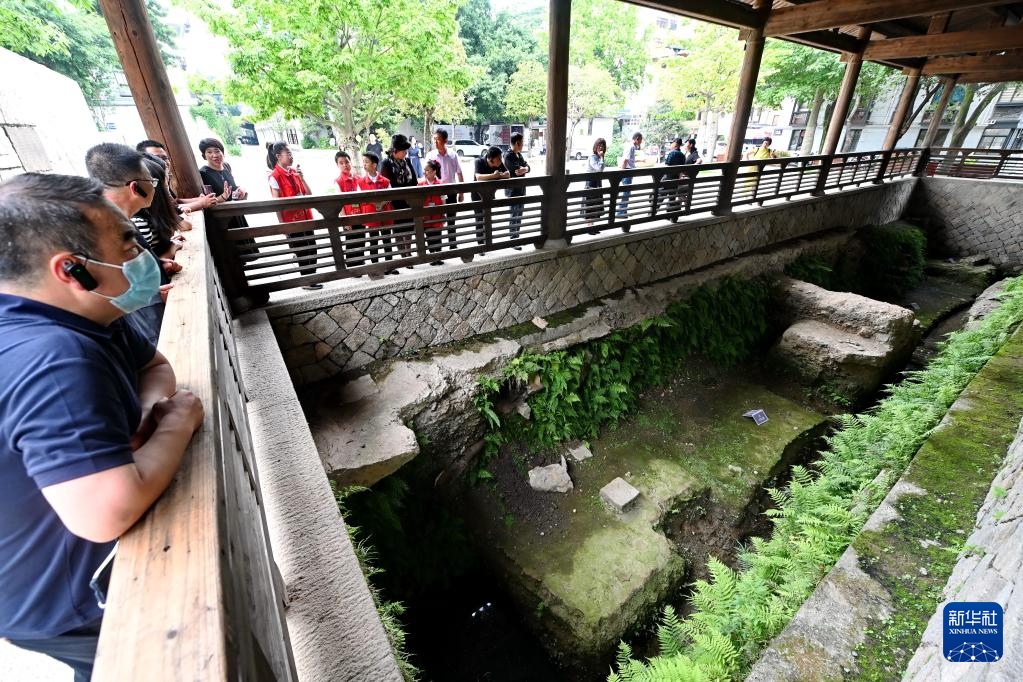 游客在福州冶山春秋园的考古发掘区唐代马球场遗址参观(5月16日摄)。