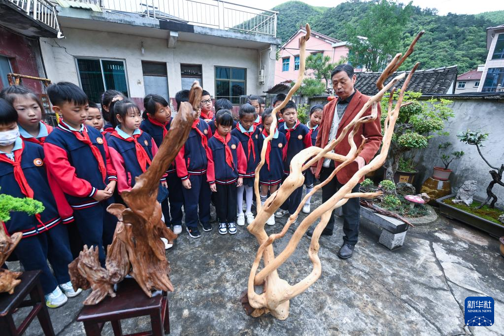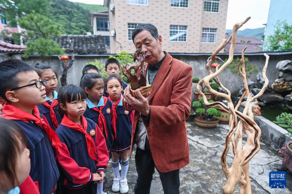 5月24日,煤山镇新民村非遗传承人佘广坤(右一)在给长兴县煤山镇中心小学的学生介绍根雕艺术。