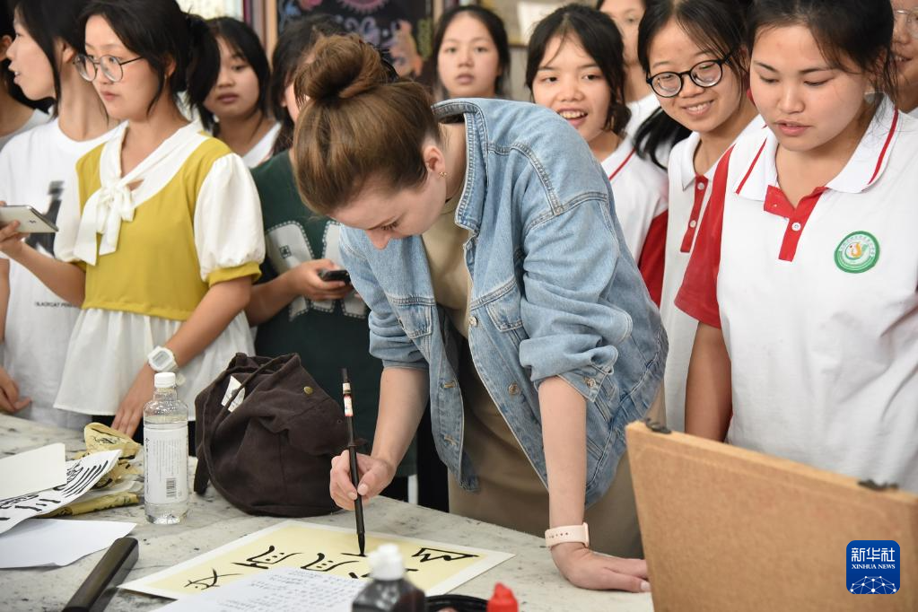 6月5日,参加三都高级中学第一届国际文化节的来华留学生学习书写水族文字。
