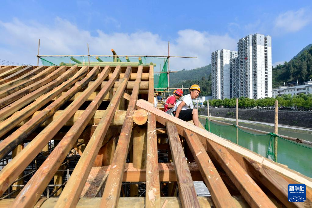 4月26日,在湖北省宣恩县沙道沟镇老岔村,村民在修建吊脚楼。