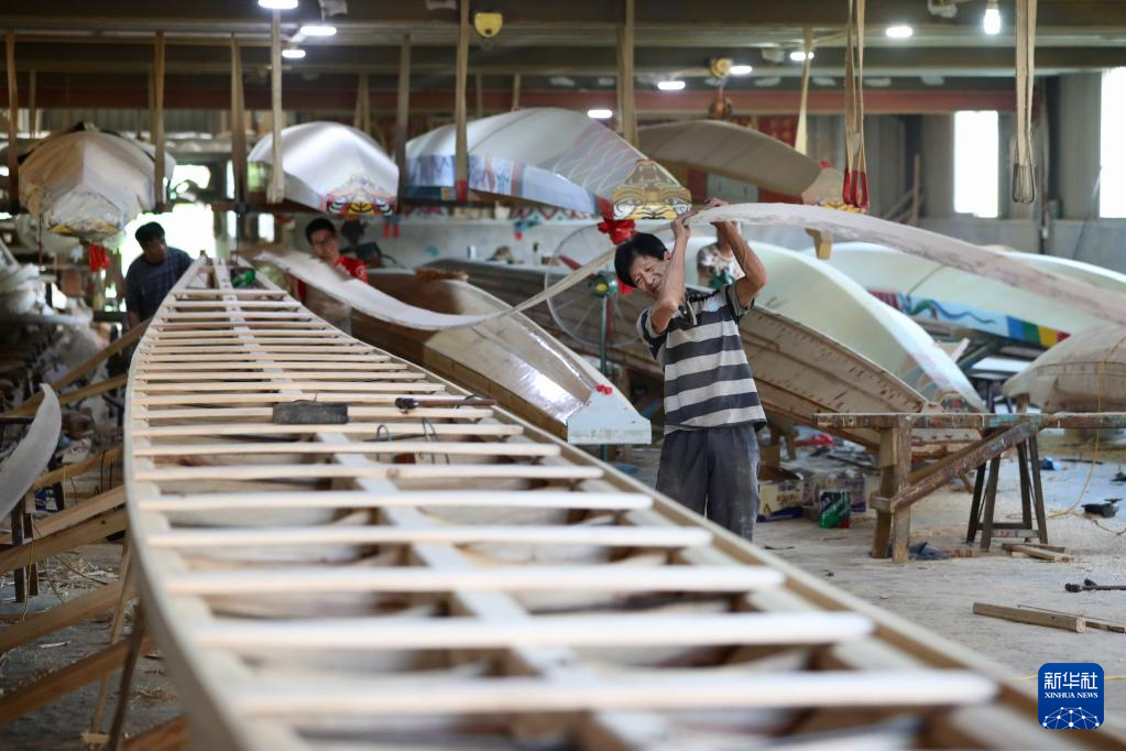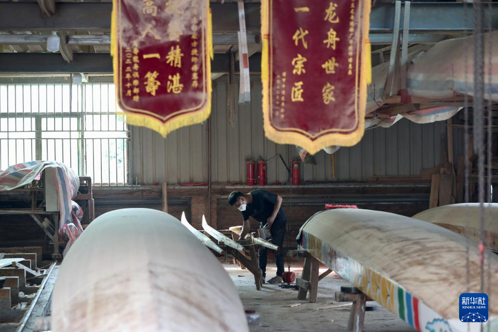 在福州市闽侯县方庄村方和勇龙舟厂,匠人在制造龙舟(6月12日摄)。
