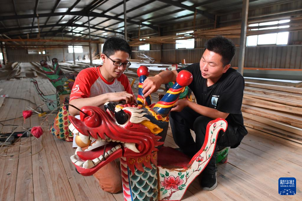 在福州市闽侯县方庄村“龙舟世家”方忠雄龙舟厂,方庄村新一代龙舟技艺传承人方剑伟(左)在与画师一起修复旧式龙头(6月12日摄)。