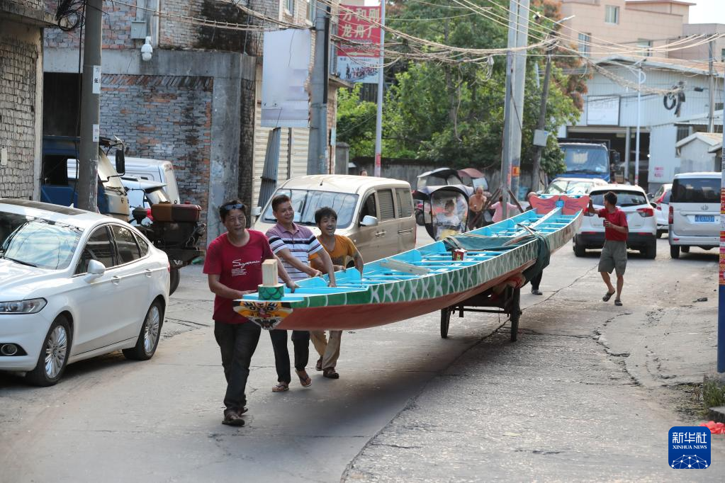 福州市闽侯县方庄村村民在转运新龙舟(6月12日摄)。