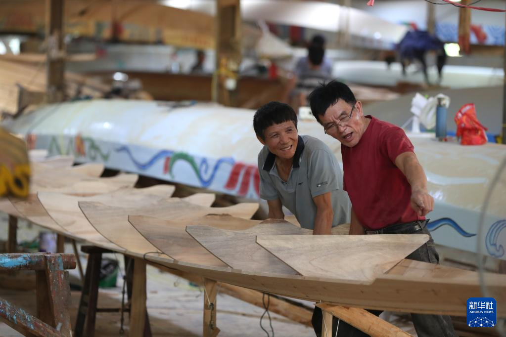 在福州市闽侯县方庄村“龙舟世家”方忠雄龙舟厂,工匠们赶制龙舟(5月23日摄)。
