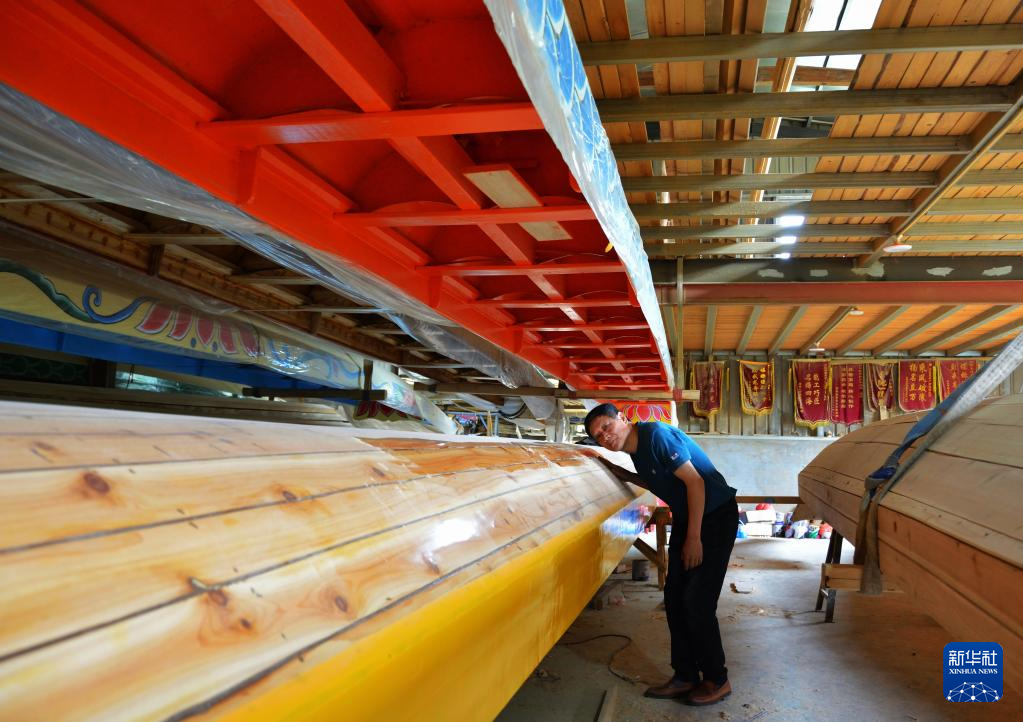 在福州市闽侯县方庄村“龙舟世家”方忠雄龙舟厂,福州市非物质文化遗产“方庄龙舟制造技艺(闽侯县)”传承人方绍晃查看传统龙舟(5月23日摄)。