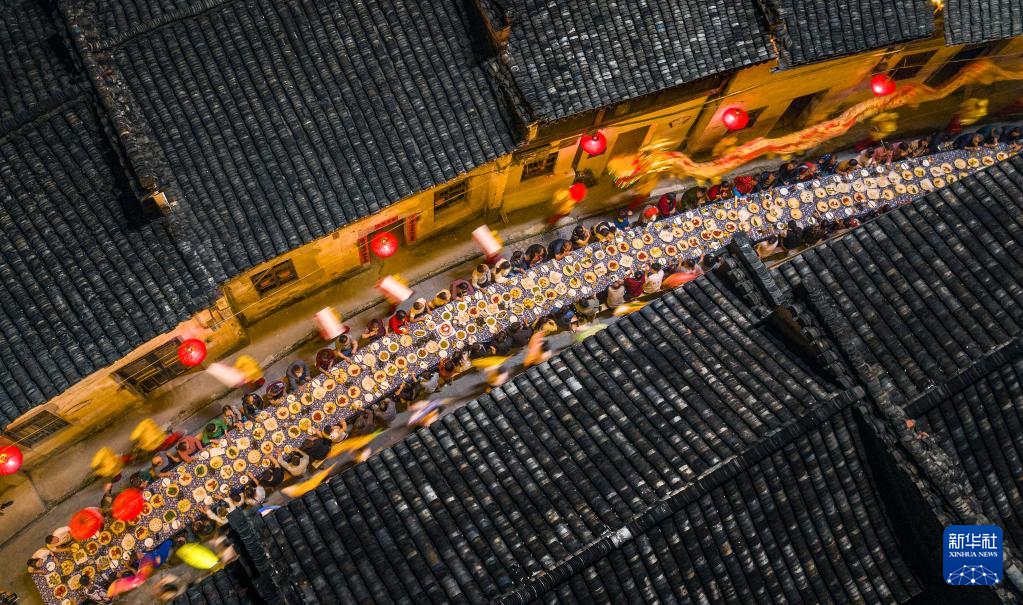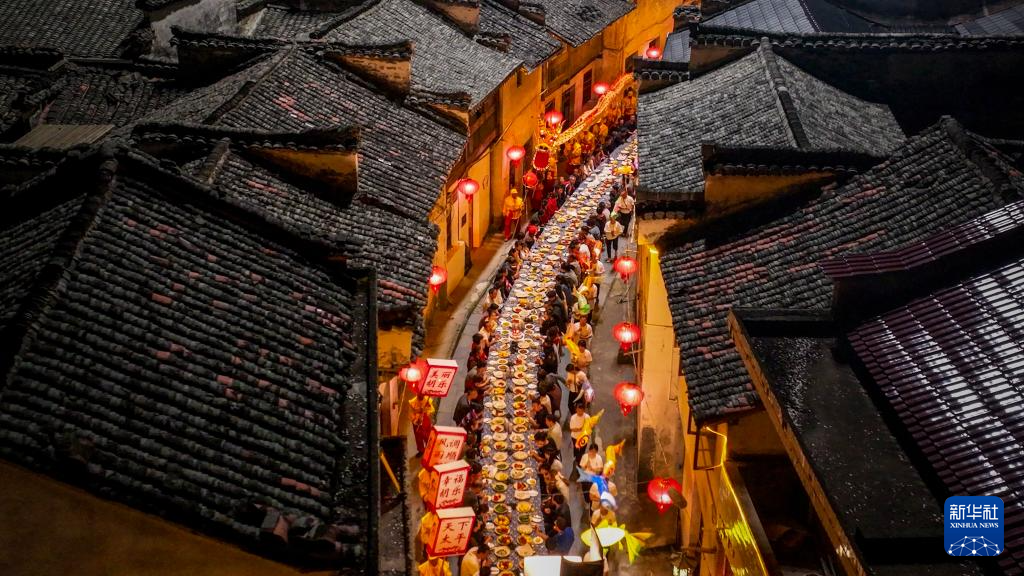 6月16日,村民舞着龙灯经过安徽省宁国市胡乐镇老街上举办的长桌宴(无人机照片)。