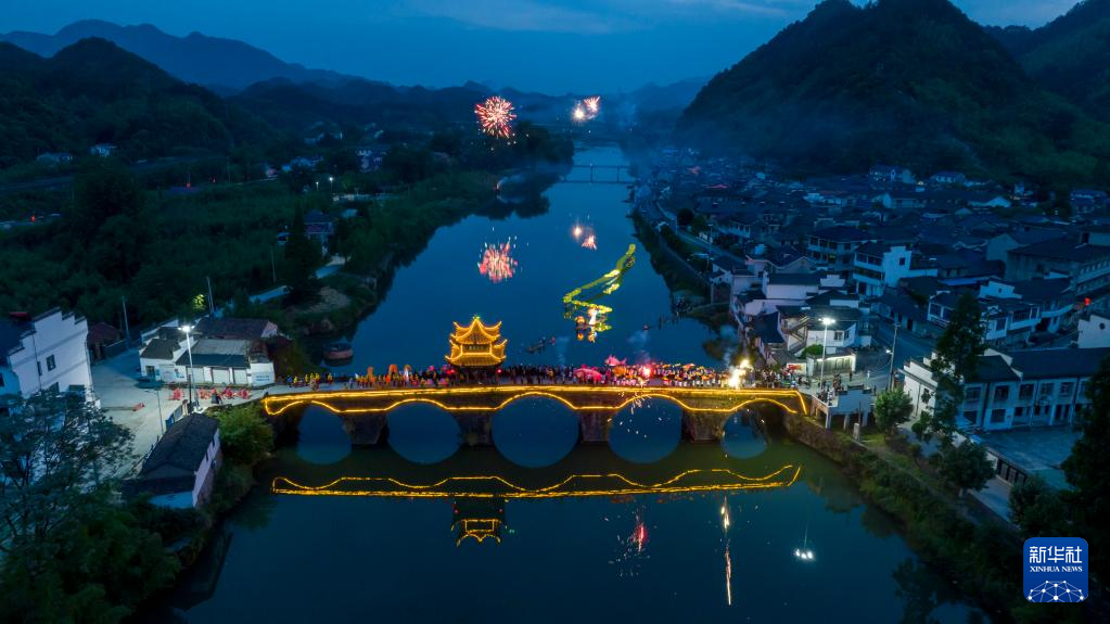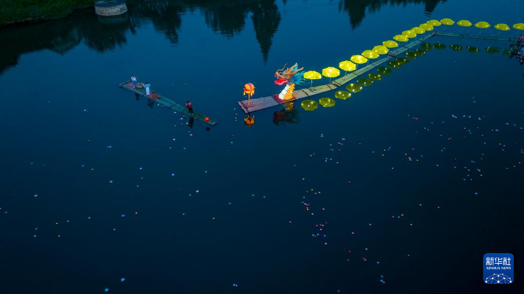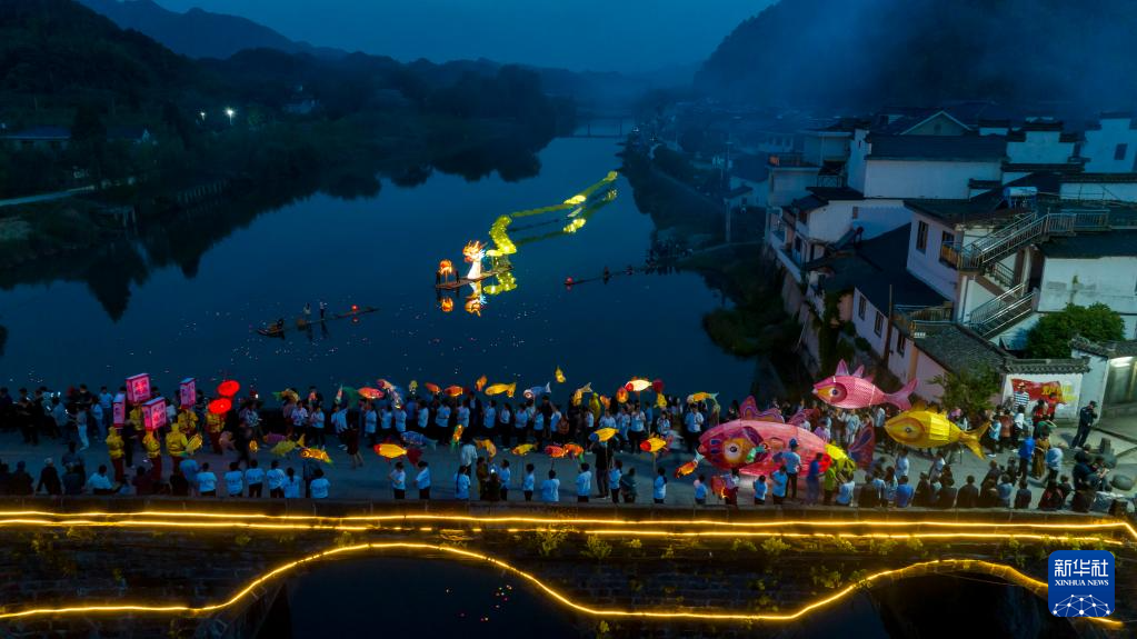 6月16日,在安徽省宁国市胡乐镇,“鱼灯”“河灯”和“龙灯”相互辉映(无人机照片)。