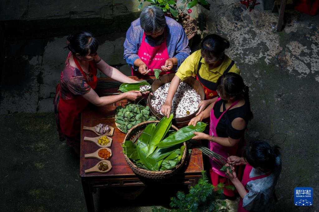 6月17日,安徽省宁国市胡乐镇村民在包粽子。
