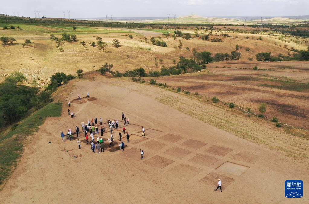 俯瞰敖汉西大梁遗址发掘现场(7月5日摄,无人机照片)。