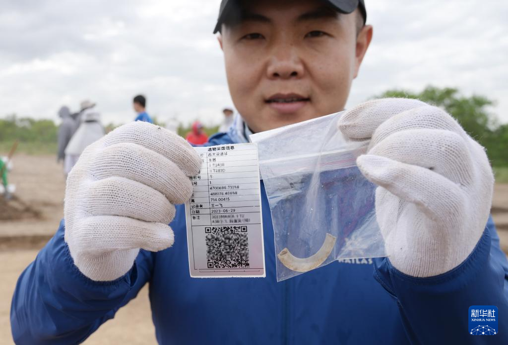 7月5日,考古队工作人员展示一件在遗址现场采集的文物。