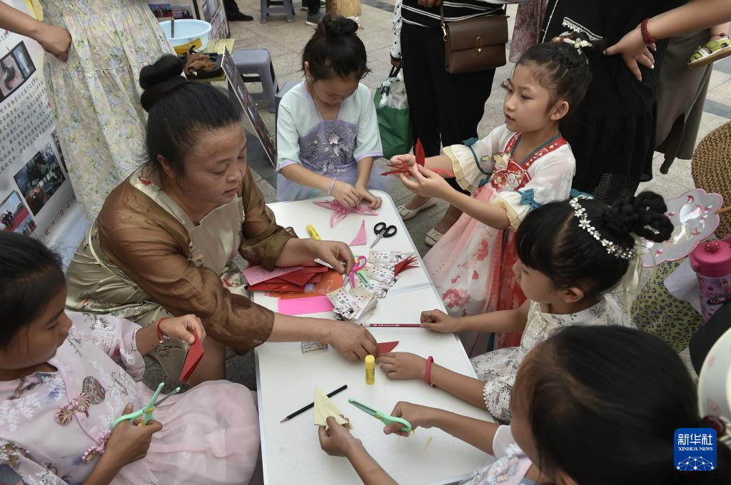 7月14日傍晚,小朋友在开封市开元广场设立的“非遗市集”现场体验剪纸技艺。
